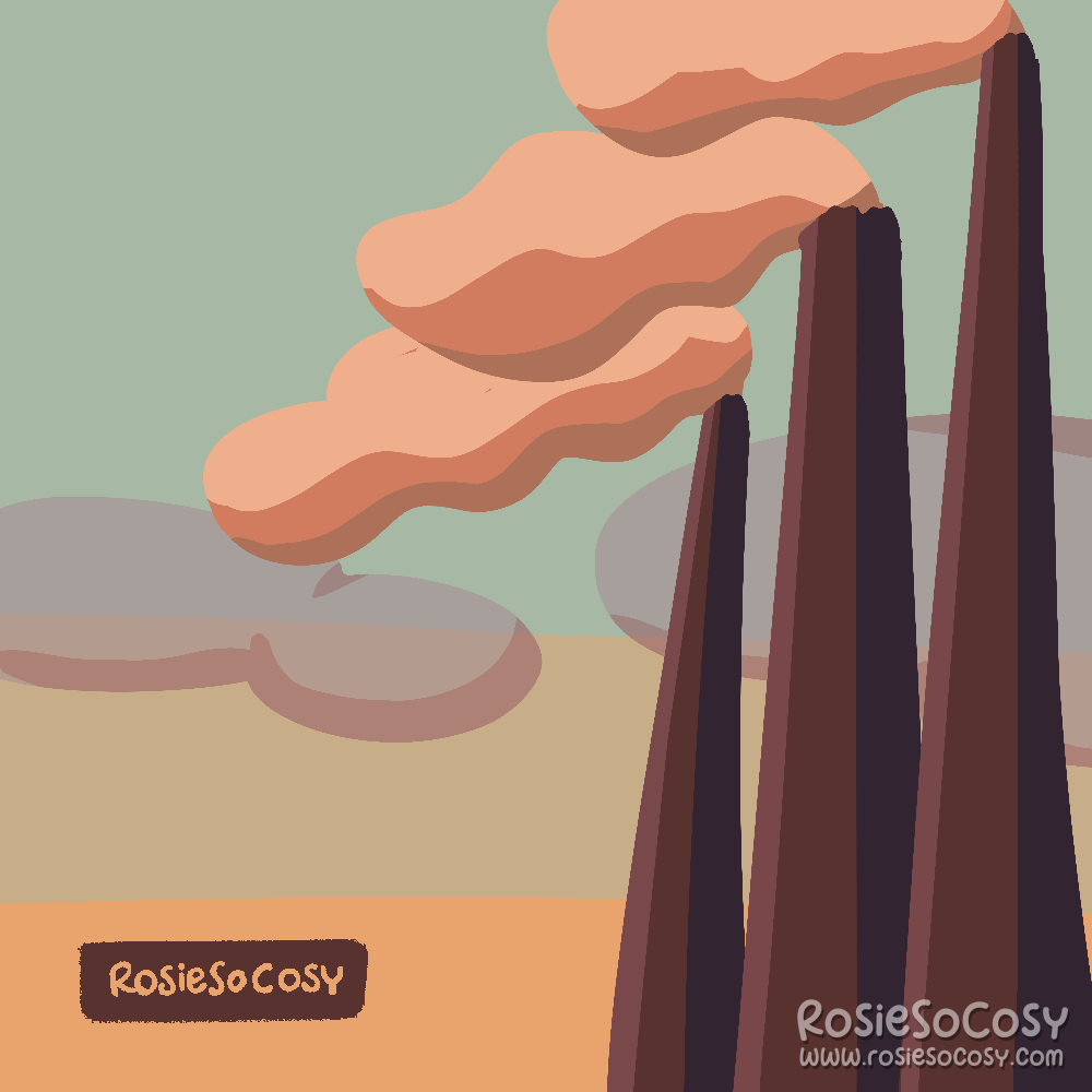 An illustration of three giant factory chimneys, with exhaust coming out of them.