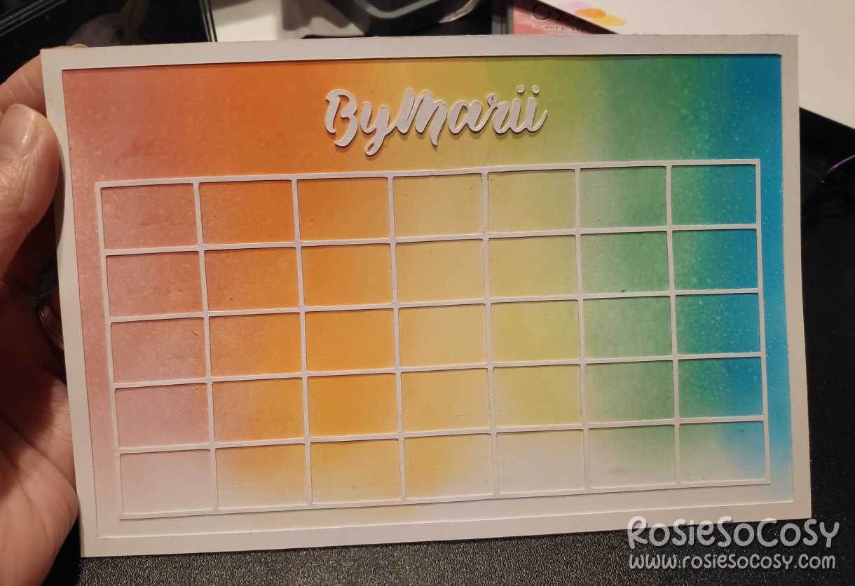 In that theme (of calendars), I decided to craft a custom card for her. I made a rainbow backdrop with Distress Oxide inks. I designed the elements on my PC and cut some items with the Silhouette Cameo. Placing the tiny white border proved to be a lot harder than I anticipated, but I managed.